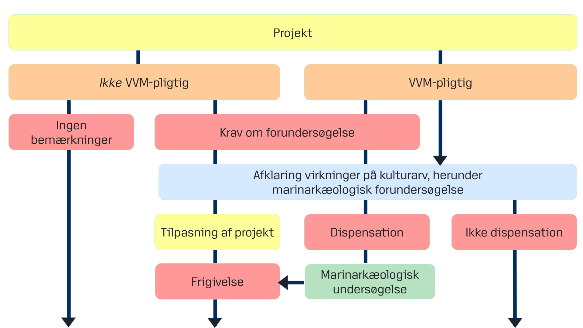 - Er det ikke muligt indenfor projektet at respektere beskyttede fortidsminder, stenalderbopladser, vrag, skibsladninger eller andre genstande, skal der ansøges om dispensation fra beskyttelsen i museumsloven. Slots- og Kulturstyrelsen foretager altid en konkret vurdering af, om der i de enkelte tilfælde kan dispenseres til at foretage ændringer i beskyttet kulturarv på havbunden. Se Vejledning om marinarkæologiske undersøgelser.